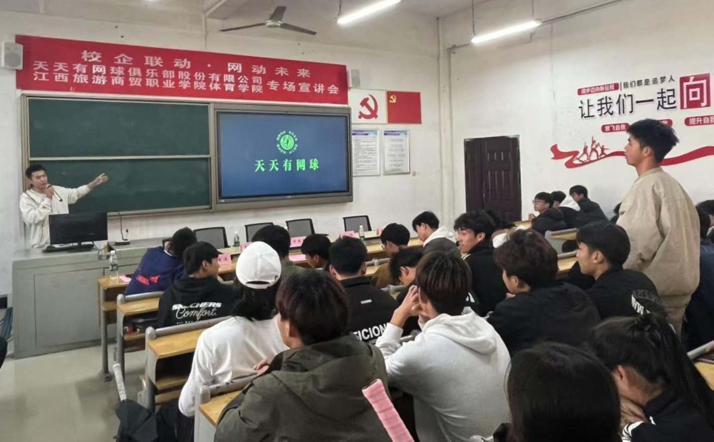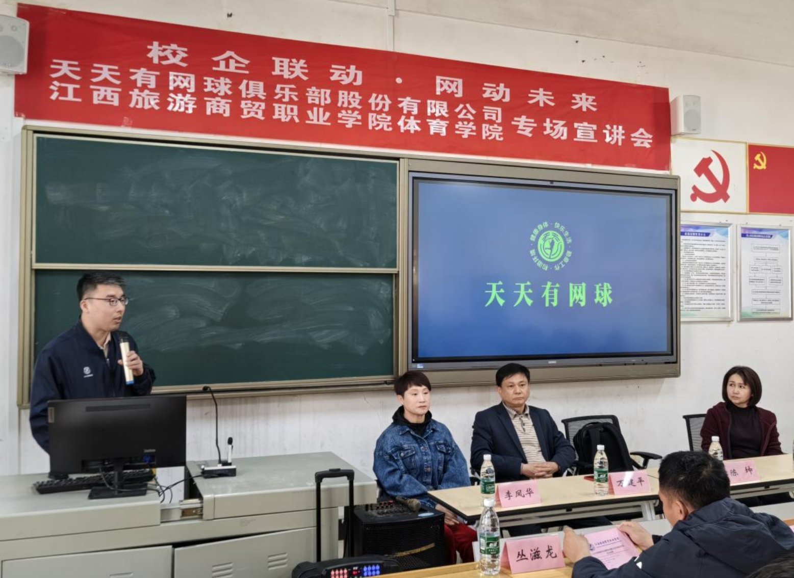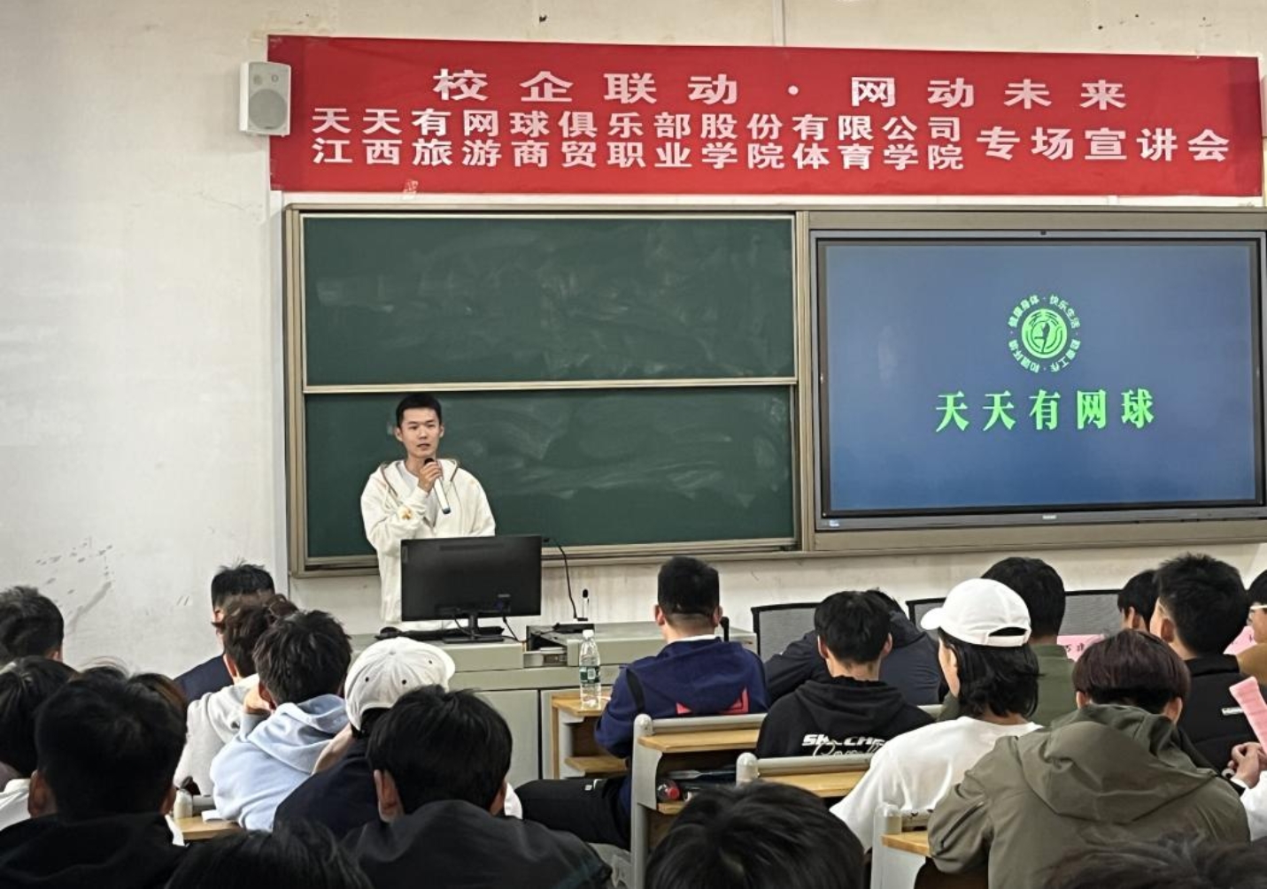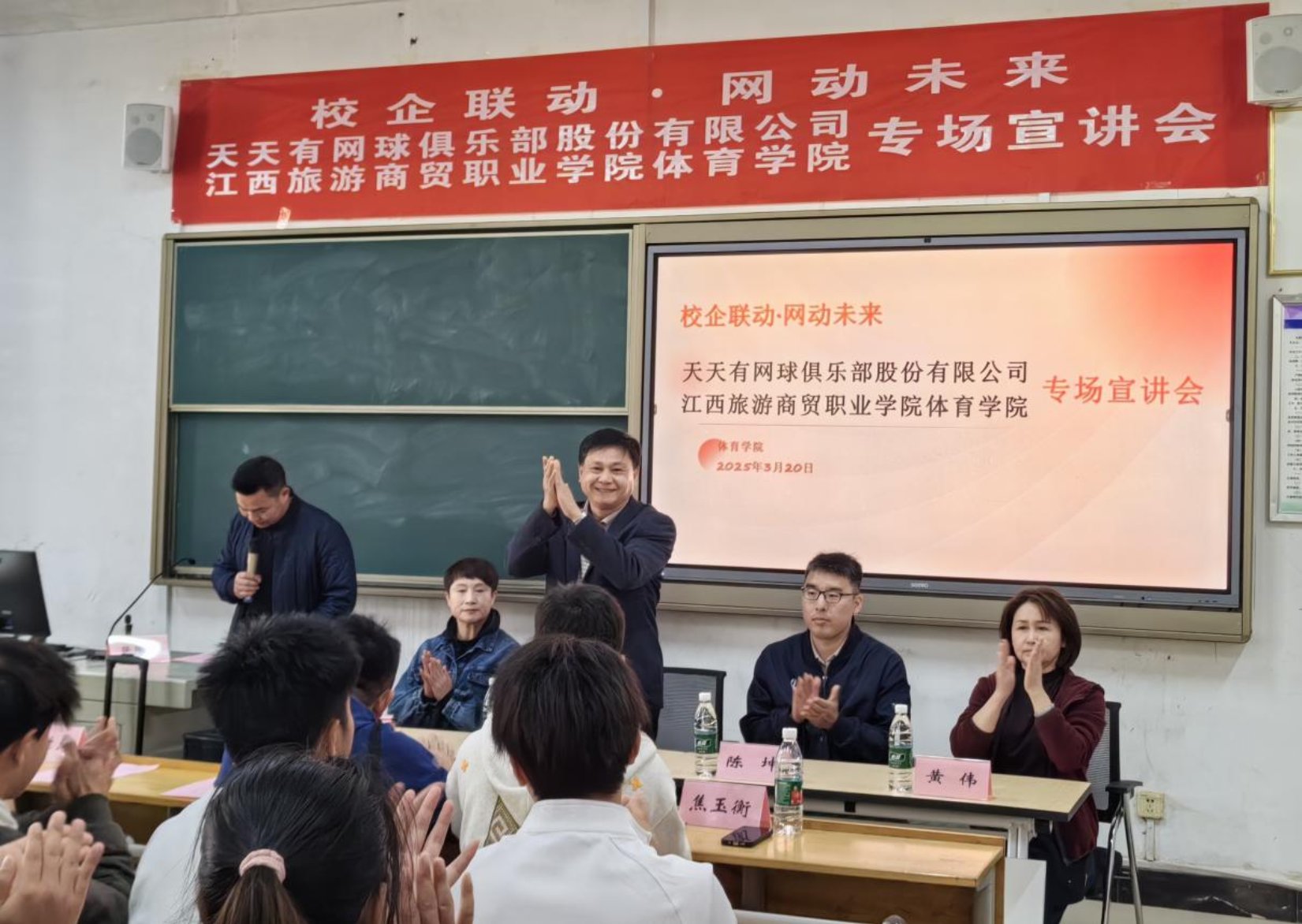 2025年3月20日下午,天天有网球俱乐部股份有限公司专场宣讲会在我校体育大楼101教室举行,校党委委员、副院长万建平,beats365亚洲版院长黄伟、副院长张茂松、网球专业教师夏有浸、丛滋龙,天天有网球俱乐部股份有限公司总经理陈坤、竞赛部顾问李凤华、培训部副部长焦玉衡以及2023级、2024级社会体育专业网球专项全体学生参会。