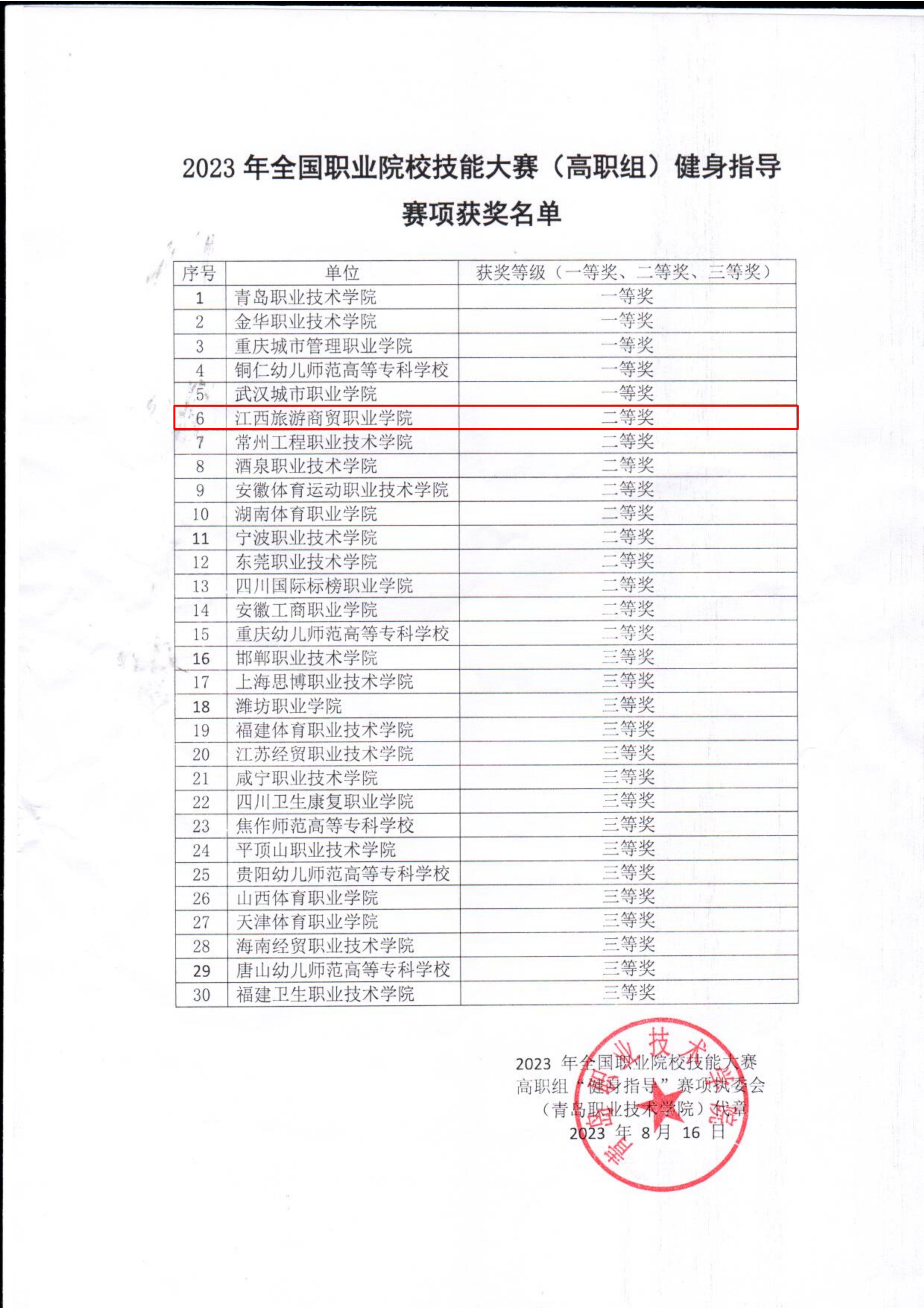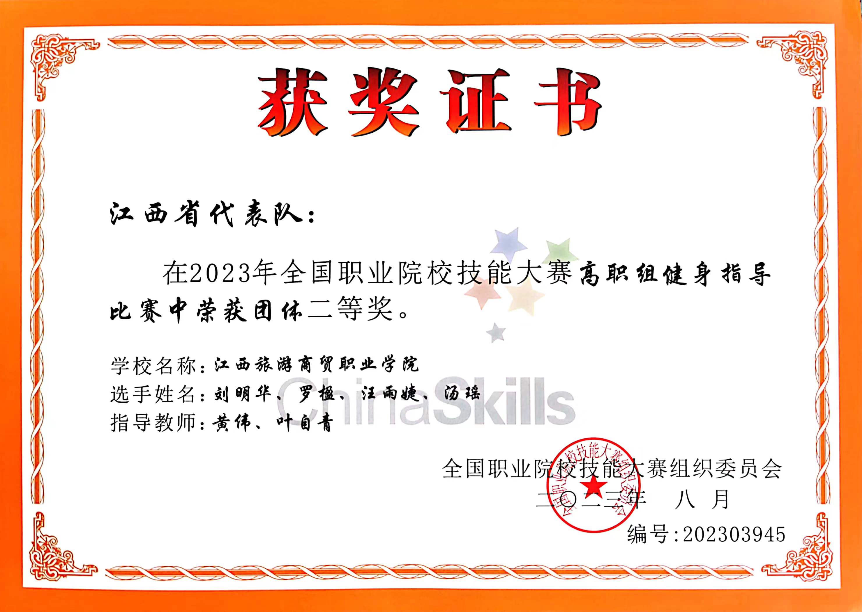 8月13日--16日,2023年全国职业院校技能大赛(高职组)“健身指导”赛项在青岛职业技术学院顺利举行。我校与来自全国各地51所院校的51支参赛队伍激烈角逐,最终以总分91.45分斩获全国二等奖。