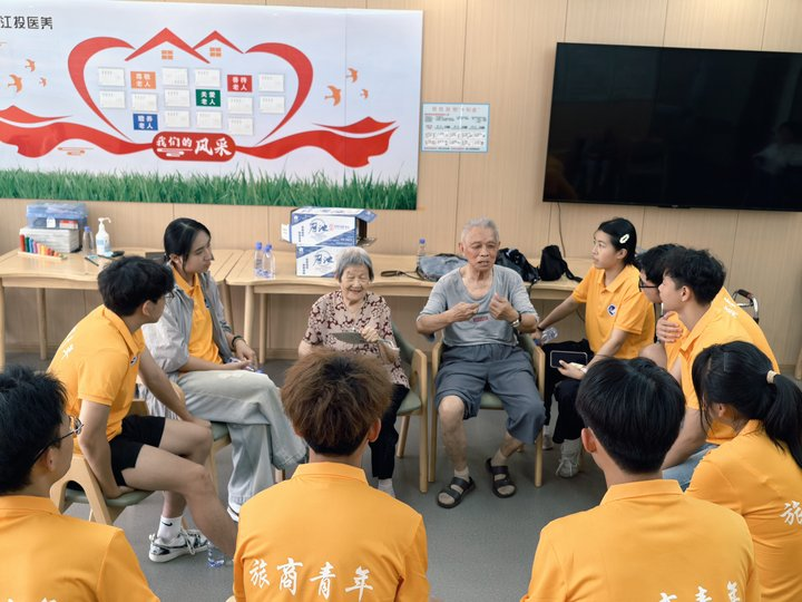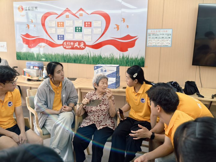 99岁万奶奶的居室里,笑声像春日暖阳般漫溢开来。靠窗的藤椅上,老人飞针走线绣着牡丹,银线在布面流转如溪,抬头时眼角的皱纹里盛着笑意,这般活力令队员们连连惊叹。“心态要好,不与人生气”,她捻着绣线轻声道来,朴素话语里藏着穿越近百年风雨的人生智慧。院长在一旁动情讲述,万奶奶一生如温润玉石,待人温和豁达,从未与邻里红过脸,如今还常捧着平板电脑学看新闻,对新鲜事物总葆有孩童般的好奇。这盏在岁月长河里始终明亮的“心灯”,以乐观通达的生命姿态,为青年学子们点亮了一堂直抵心灵的生命教育课。