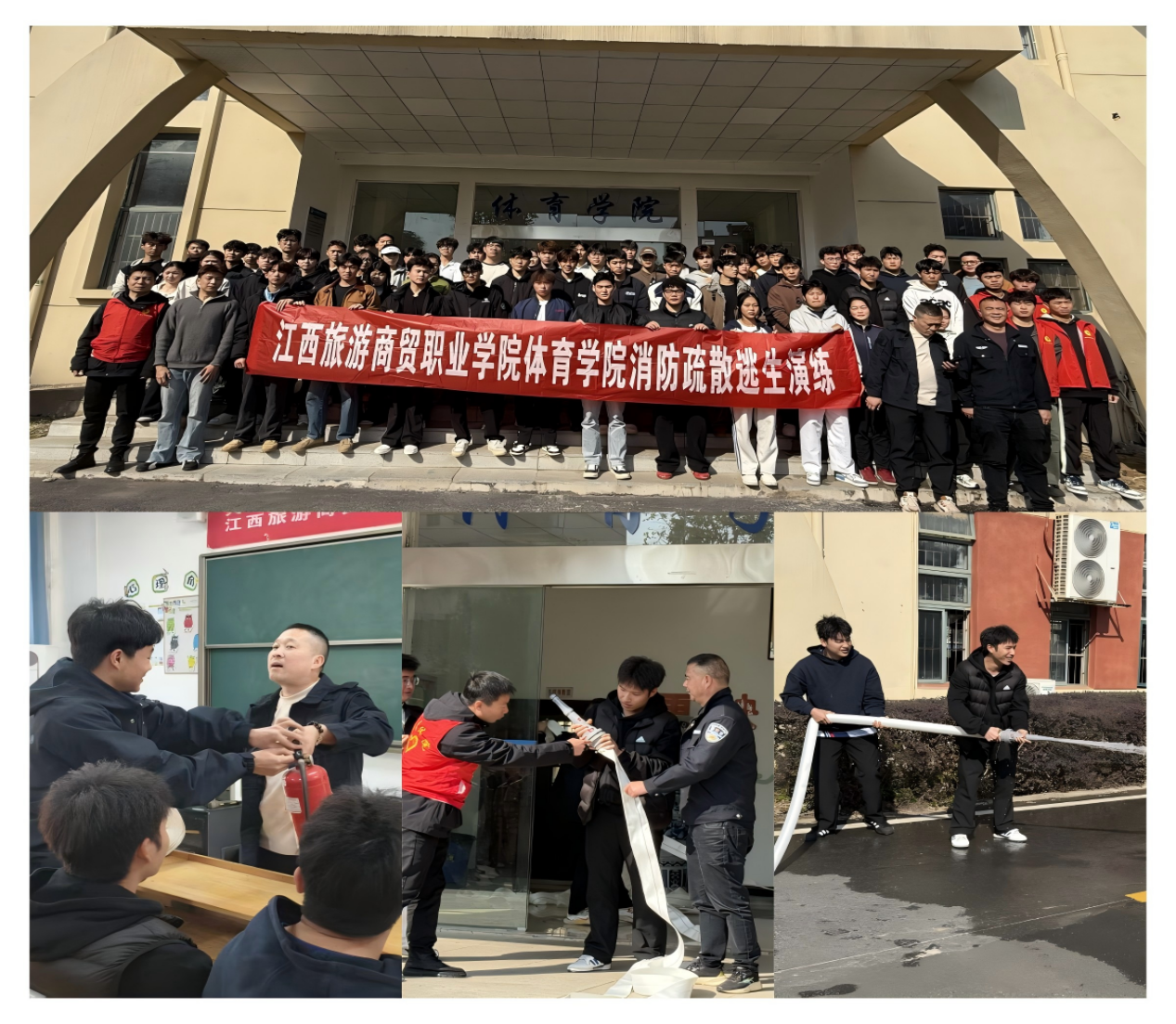 为确保全体参与人员熟练掌握消防器材使用方法,活动采用分批次培训的形式,针对性开展灭火器、室内消火栓实操教学。保卫处同志现场示范器材操作步骤,细致讲解提、拔、握、压的灭火器使用要领,以及消火栓开箱、接水带、开阀门的规范流程,手把手指导参与师生逐一上手实操,及时纠正操作误区。通过沉浸式实操实训,切实让每一位参与人员做到“会报火警、会使用器材”,真正掌握火场初期灭火的实用技能。随后,应急逃生演练正式启动。全体参与人员在保卫处工作人员及辅导员的有序引导下,严格按照疏散预案要求,弯腰捂鼻、低姿前行,沿着预定疏散路线快速、有序、安全地撤离至体育大楼外指定安全区域,全程无拥挤、无慌乱,演练流程顺畅高效。