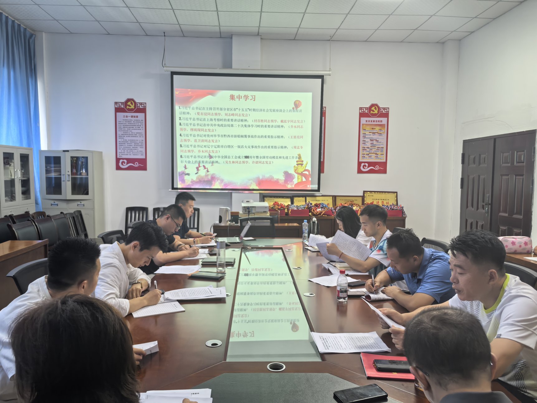 在理论学习环节,夏有浸、付百胜、乔木、王星亮、周孟冬等同志分别带领全体党员共同学习了《习近平总书记在主持召开部分省区市“十五五”时期经济社会发展座谈会上的重要讲话精神》、《习近平总书记在上海考察时的重要讲话精神》、《习近平总书记在中共中央政治局第二十次集体学习时的重要讲话精神》、《习近平总书记对贵州毕节市黔西市游船倾覆事故作出的重要指示精神》、《习近平总书记对辽宁辽阳市白塔区一饭店火灾事故作出的重要指示精神》、《习近平总书记在庆祝中华全国总工会成立100周年暨全国劳动模范和先进工作者表彰大会上的重要讲话精神》、《习近平总书记对双拥工作作出的重要指示精神》、习近平:激励新时代青年在中国式现代化建设中挺膺担当(《求是》2025年第9期)、《中共中央政治局会议精神(2025年4月25日)》、纪言:八项规定改变中国(中央纪委机关编写)、《党的十八大以来深入贯彻中央八项规定精神的成效和经验》(中央党的建设工作领导小组组织编写)、《中华人民共和国民法典》及江西省安全生产“1+7”体系文件和《关于进一步提升基层应急管理能力的若干措施》等重要内容。