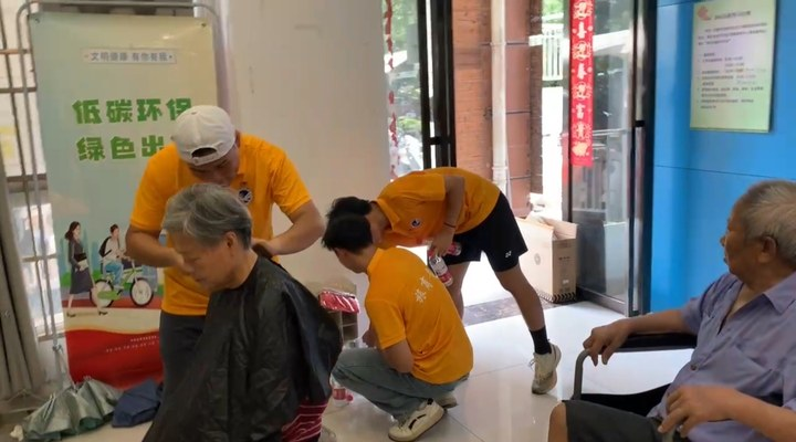 理发区: 经过培训的志愿者细心询问老人需求,精心修剪发型,贴心交流赢得老人满意笑容。