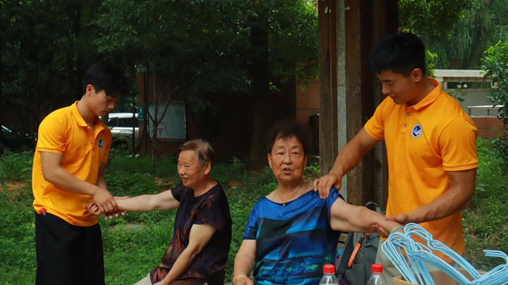 运动康复服务区: 志愿者运用专业知识为老人缓解肩颈酸痛,并讲解日常拉伸技巧,专业细致的服务获得居民连连称赞。