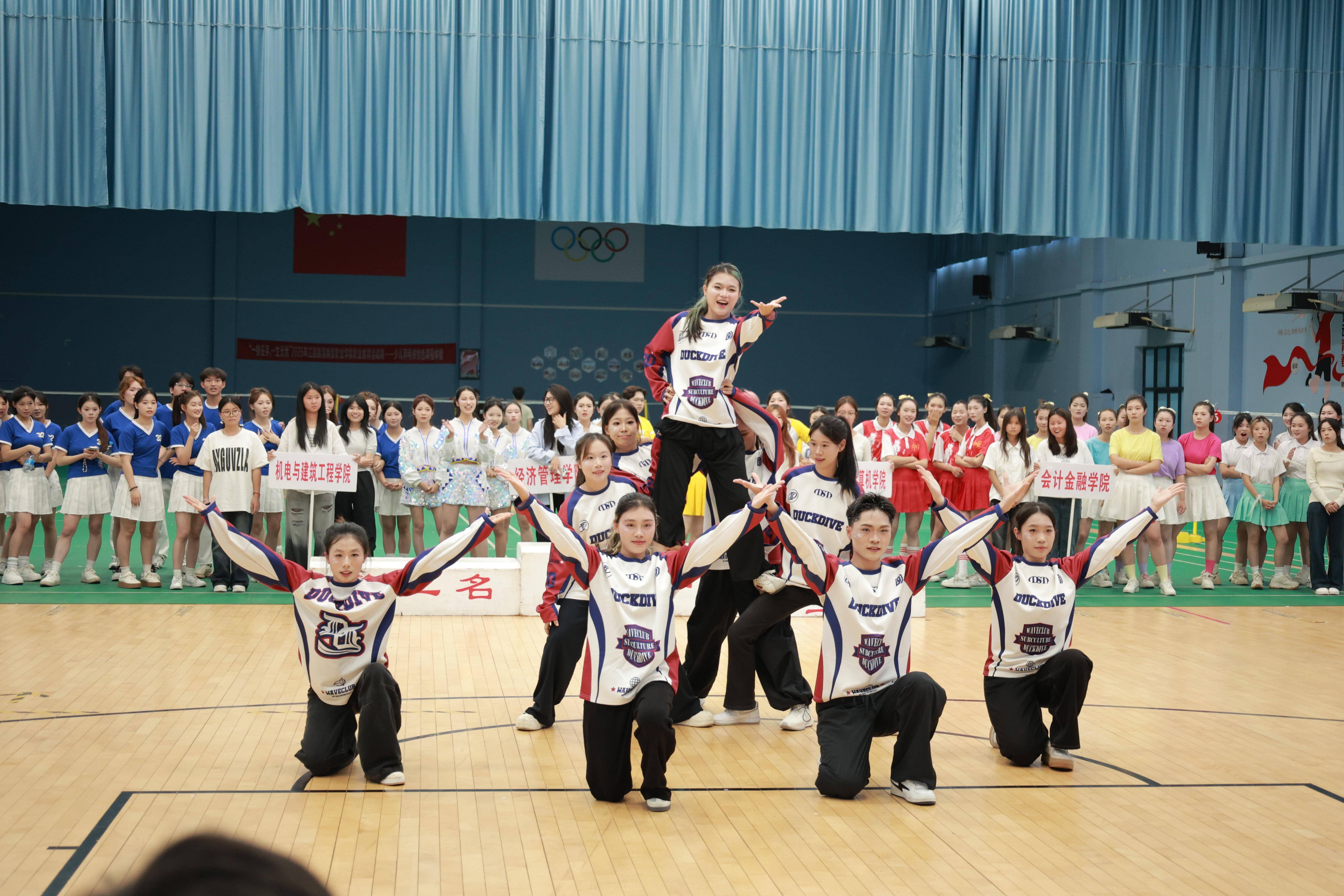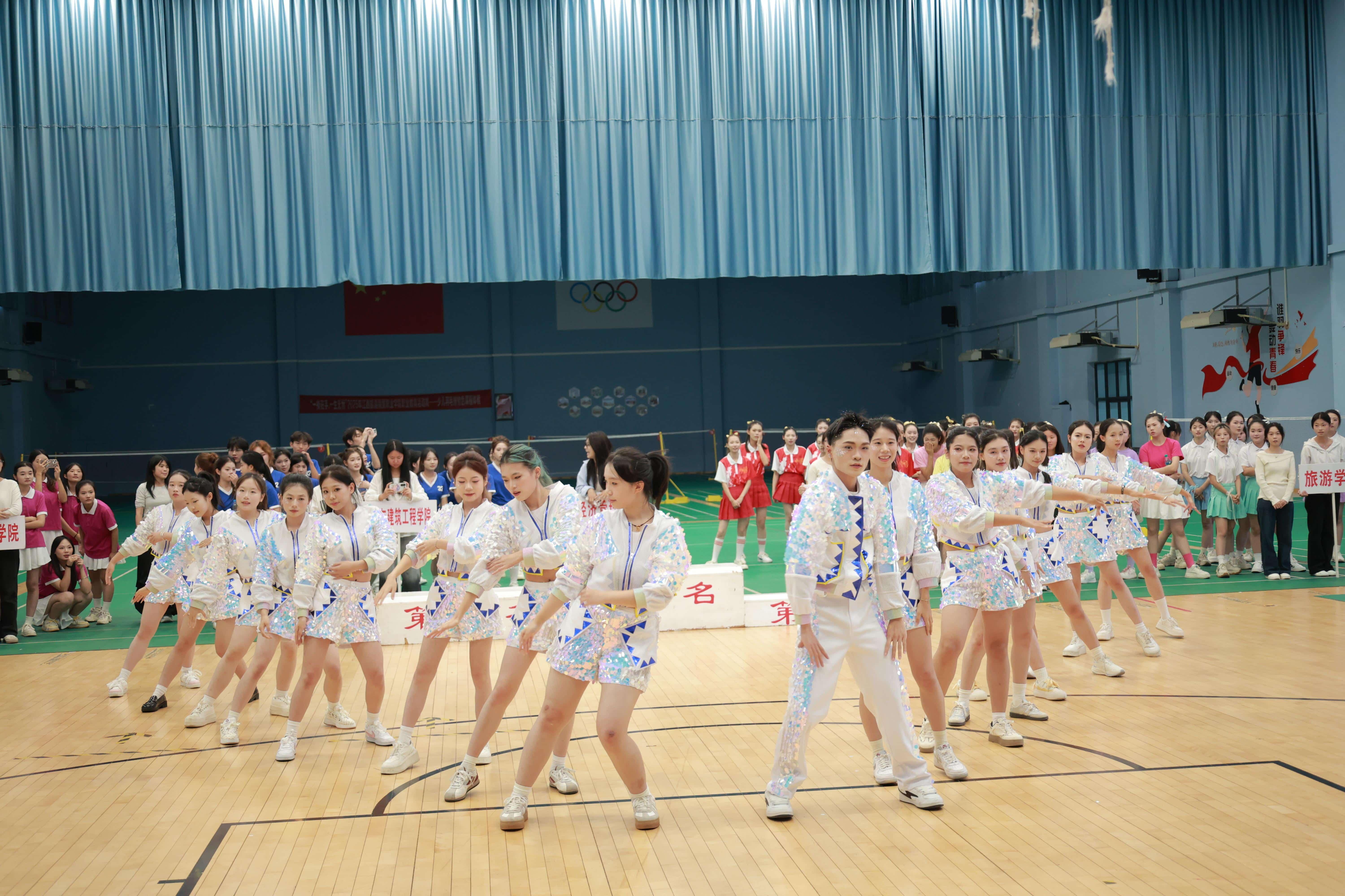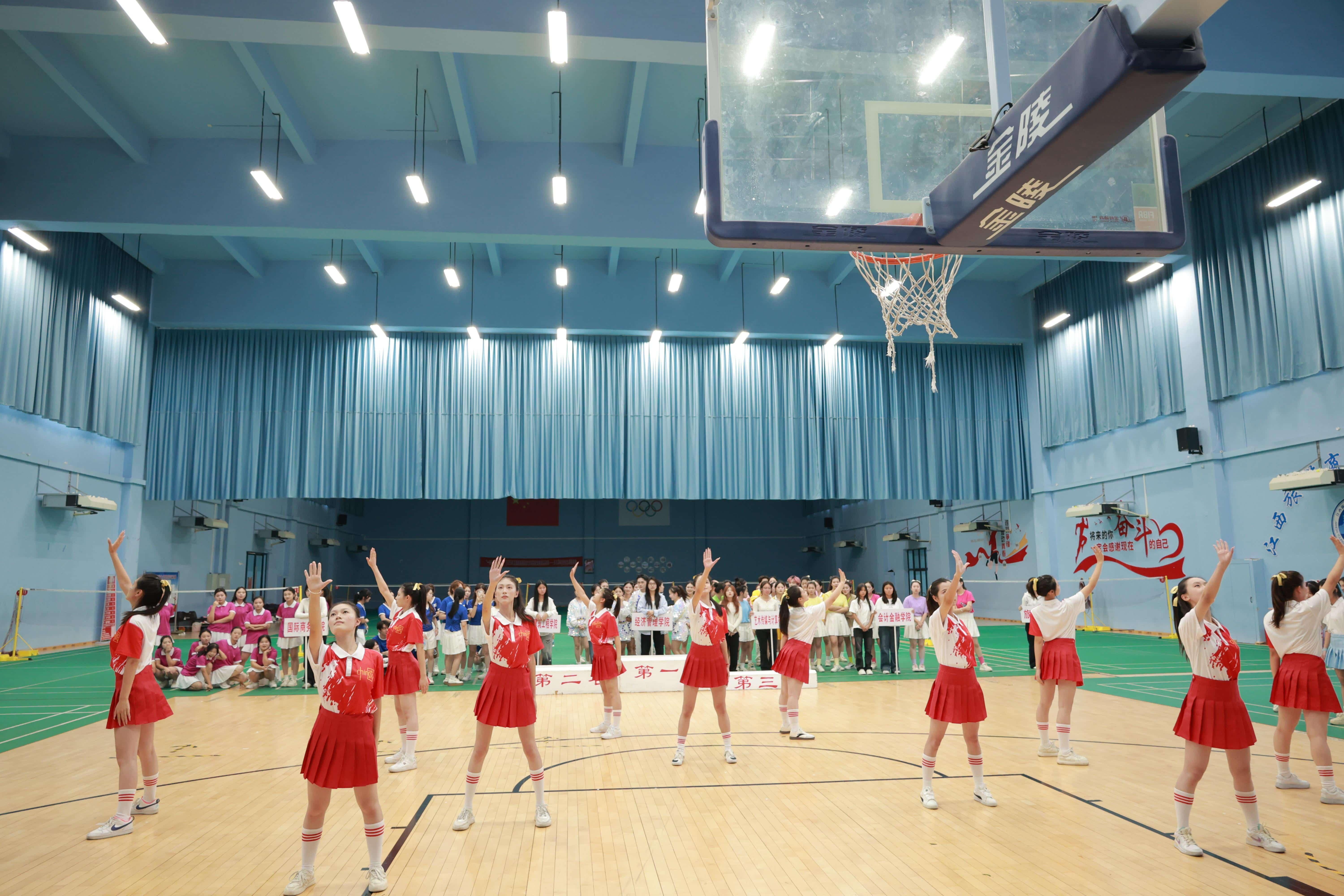 比赛当天,体育馆内氛围热烈。各参赛队伍风格迥异、创意十足,有的以校园主题展现蓬勃朝气,有的融入民族元素传递文化魅力,有的凭借队形变换呈现丰富视觉效果。学子们精神饱满、动作整齐,每一个舞姿都充满力量与美感,现场喝彩声、掌声此起彼伏。