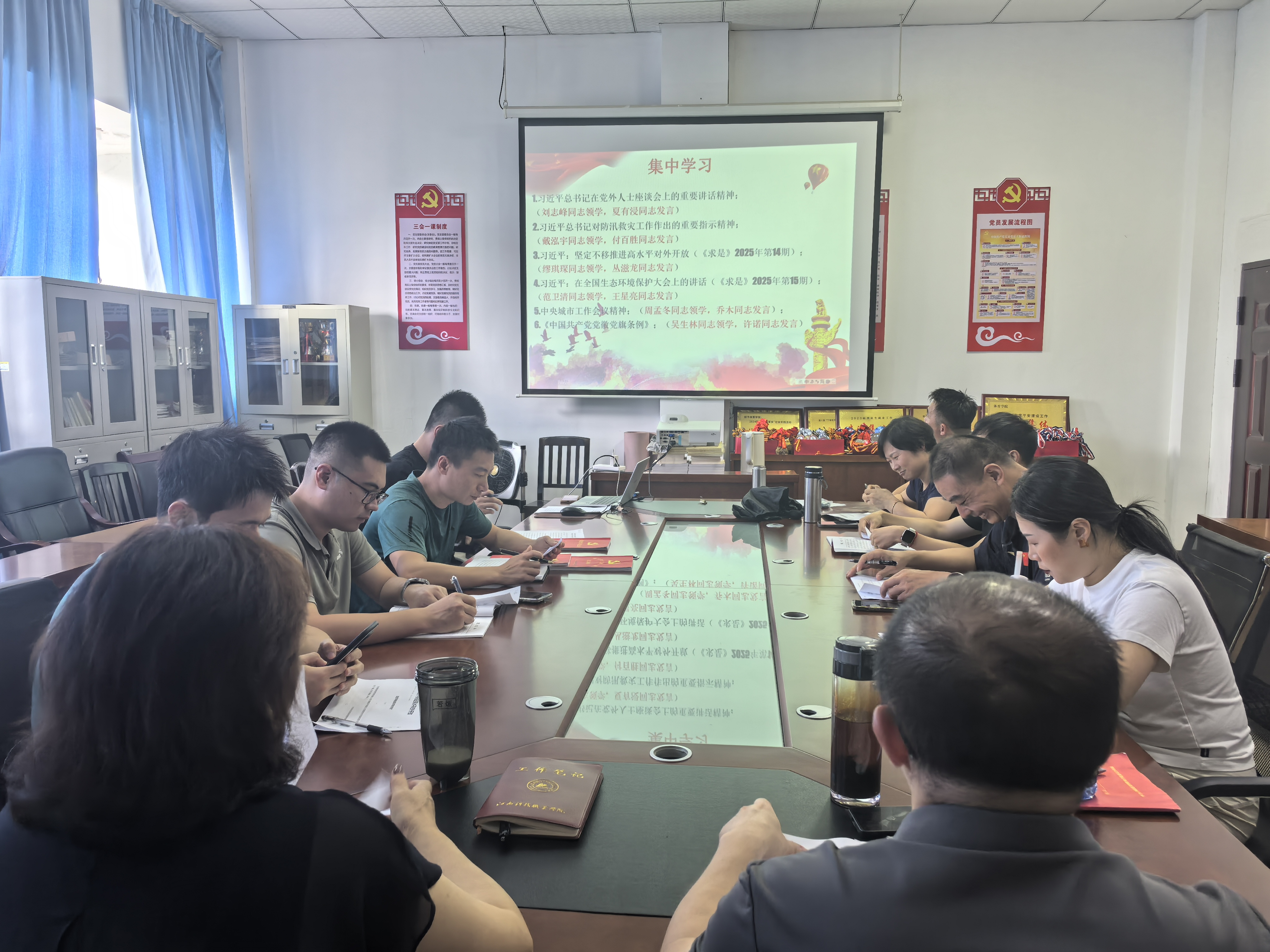 在理论学习环节,刘志峰、戴泓宇、缪琪琛、范卫清、周孟冬等同志分别带领全体党员共同学习了《习近平总书记在党外人士座谈会上的重要讲话精神》、《习近平总书记对防汛救灾工作作出的重要指示精神》、习近平:坚定不移推进高水平对外开放(《求是》2025年第14期)、习近平:在全国生态环境保护大会上的讲话(《求是》2025年第15期)、《中央城市工作会议精神》、《中国共产党党徽党旗条例》、《中华人民共和国公司法》、《中华人民共和国农业法》、中共中央办公厅 国务院办公厅《整治形式主义为基层减负若干规定》、《中国共产党江西省第十五届委员会第八次全体会议精神》及《省供销联社领导干部应知应会党内法规和国家法律清单》等重要内容。