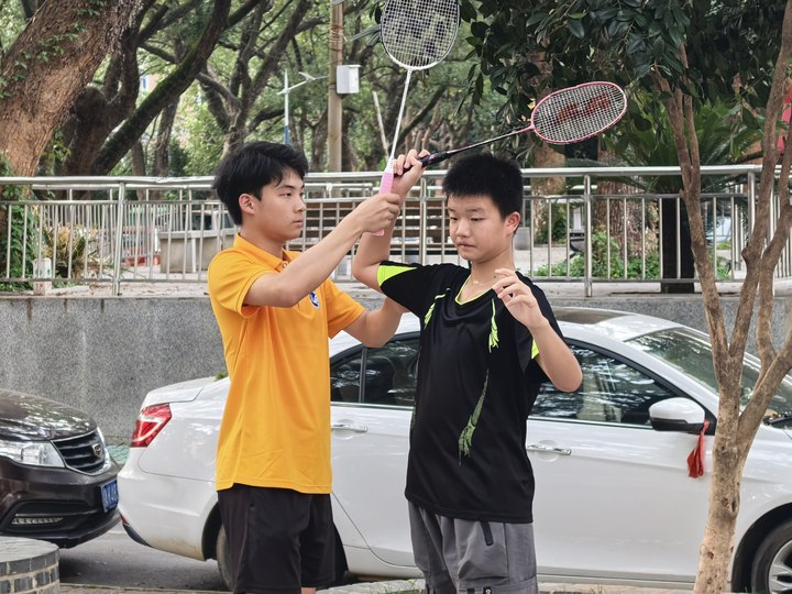 羽球翻飞间的勇气课堂:另一侧空地,羽毛球如白色精灵在孩童与志愿者间穿梭。队员们半蹲身子,手把手校准握拍的弧度、挥拍的轨迹,“别怕,再往前一点!”的鼓励声中,孩子们从躲闪到迎球,奔跑的身影与翻飞的羽球,共同织就夏日最鲜活的剪影。