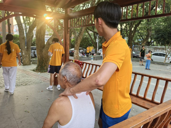 指尖传递的舒心暖意:社区活动中心内,具备专业技能的队员正为老人按摩肩颈。掌心的温度透过衣衫渗入肌肉,轻重交替的手法舒缓着常年劳损的关节。“娃娃,你这手法比按摩店还舒服!”张爷爷的笑声混着风扇的轻响,化作最动人的肯定——这份关怀,无关技巧,全在用心。