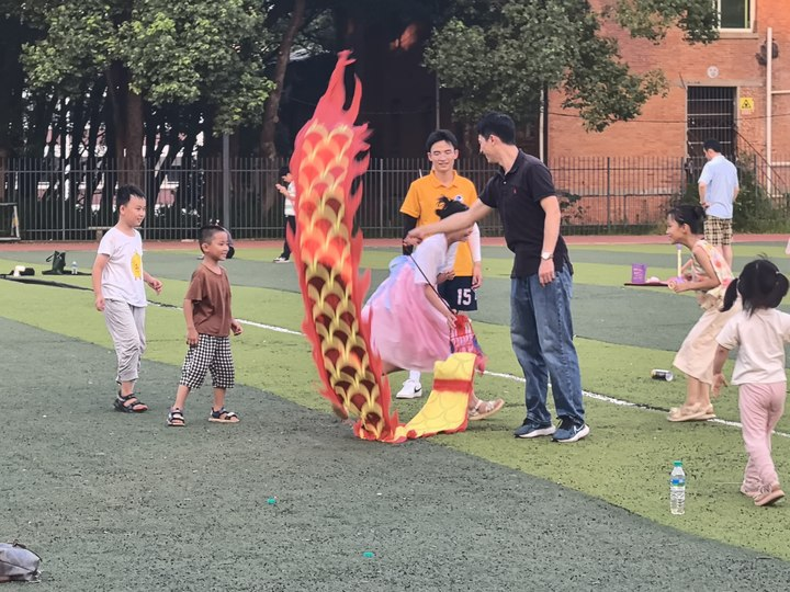 趣味游戏里的协作密码:“老鹰捉小鸡”的追逐中,志愿者张开双臂化身“鸡妈妈”,护住身后一串“小鸡”;跆拳道基础腿法体验时,孩子们跟着口令踢腿、出拳,眼神愈发坚定;彩带龙表演环节,红黄绸带在空中划出绚丽弧线,孩子们在龙身下方旋转起舞,笑声与绸带同扬——运动的快乐,在协作与体验中浸润童心。
