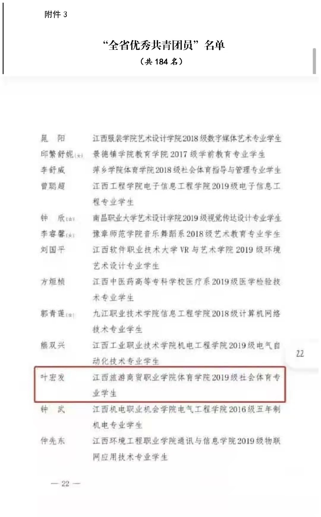 喜报:在2020年度全省“两红两优”评选中,我院2019级社会体育4班叶宏发同学获全省优秀共青团员荣誉称号!特此喜报!